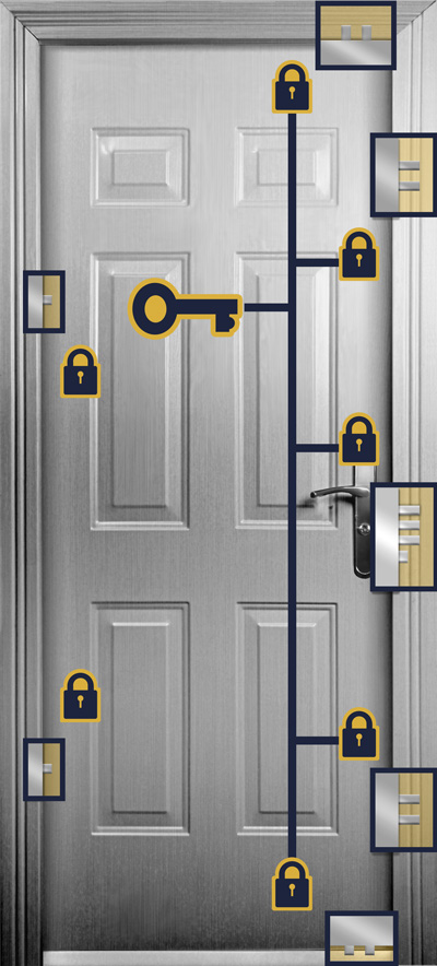 Our doors feature a unique 14 point locking mechanism that secures the door to the frame in multiple points with 20mm thick steel deadbolts.